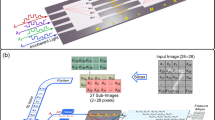 We found that OCL, designed by GMTO, could extract discriminating features with as few as nine kernels for live human skin and the thyroid tissue. The visualization results by principal component analysis (PCA)41 are shown in Fig. 2b and Fig. 3c, respectively. Fewer kernels enable higher feature compression capability, higher spatial resolution, and lower computing costs for ENLs. Particularly, compared with our previous hyperspectral imaging works34,35,36,37, SCNN uses very small number of metasurface units and provides an ONN-based approach for hyperspectral sensing, effectively avoiding the need for as many metasurface units as possible for high-precision spectral reconstruction (see Supplementary Note 1 for details). Finally, we implemented the OCUs with \(H=122\) \({{{\rm{and}}}}\) \(W=160\) by integrating millions of pixel-aligned metasurface units on top of a CIS (see “Methods” for details). The scanning electron microscopy (SEM) images of the fabricated metasurfaces are shown in Fig. 2a.