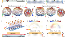 Since colloids have different responses to skyrmions, their topological textures can be deciphered by continuum simulations (see “Methods”). According to the simulations, skyrmion with colloids of φ = 180° is defined as half-anti-skyrmion (1/2, − 1/2, 0, 0), Fig. 1d, f and Supplementary Fig. 5a. Skyrmion with colloids of φ = 0° is defined as half-Néel-skyrmion (1/2, 1/2, 0, π), Fig. 1e, h and Supplementary Fig. 5b. Note that the half-skyrmion is different from that reported in the literature17, as it is not obtained by splitting the full skyrmion sphere into northern and southern hemispheres along the latitudinal direction but rather by splitting it into eastern and western hemispheres along the longitudinal direction due to geometric constraints from the substrates, as shown in Fig. 1g, i and Supplementary Fig. 6. The vector fields of anti-skyrmion, Néel-skyrmion, half-anti-skyrmion, and half-Néel-skyrmion are shown in Supplementary Fig. 6a–h.