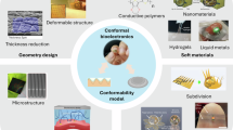 Polymers offer a combination of flexibility, inertness, electrochemical stability, and durability, which are essential for long-lasting, tissue-conforming electronics33. Polymer-based substrates and coatings have been proposed to reduce the mechanical mismatch at the electrode-tissue interface, while conductive polymers have been developed to reduce electrode impedance77. Insulating polymers like polydimethylsiloxane (PDMS), parylene-C, SU-8, polyimide (PI), and polyethylene terephthalate (PET) possess the required inertness, medium-term hermeticity, biocompatibility, and processibility with conventional lithographic and micromachining techniques33. As such, these polymers are the typical materials of choice for the substrate and encapsulation of flexible neuroelectronic interfaces78. For example, a PDMS-based implant, comprised of a PDMS substrate, Au interconnects, and soft electrodes with a Pt-PDMS composite, was developed to mimic the shape and elastic modulus of the spinal dura mater60. The implant – named the e-dura – was used to restore locomotion after spinal cord injury in rats by concurrent serotonergic drug delivery through a microfluidic channel and continuous electrical stimulation to specific spinal segments60. No significant difference was observed in the expression of activated astrocytes or microglia in lumbosacral spinal cord sections of rats implanted with the e-dura for 6 weeks compared to sham60. Similarly, direct photolithography of Au on SU-8 was used to fabricate endovascular probes that can be delivered into sub-100 μm vessels of rat brains79. Once injected, these flexible probes adhere like a stent to the walls of the blood vessel and can be used to record local field potentials as well as single-unit (SU) spikes with minimal chronic inflammatory response79. The same polymer has also been used for ultrathin (<1 μm) neuron-like Pt electrodes, engineered to approximate the mechanical properties of neural cells49. These probes exhibited bending stiffness of approximately \(1.4 \sim 5.7\times {10}^{-16}{\rm{N}}\cdot{{\rm{m}}}^{2},\) which was at least 5 times lower than that of other flexible neural implants63,80,81,82 and comparable to that of an axon (\(5.9 \sim 7.6\times {10}^{-16}{\rm{N}}\cdot{{\rm{m}}}^{2}\), depending on the diameter)49,83. Thin-film microelectrode arrays have also been fabricated by micropatterning nanomaterials like graphene55,84,85,86,87, Ti3C2Tx MXene54,88,89, carbon nanotubes90 and Pt nanorods91 on thin (<10 μm) polymeric substrates.