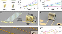 The pattern and structural dimensions of the M-SRuM inductors and capacitors before rolling up are shown in Fig. 2a, e. The layout design of the components encompasses both the component section and the test fixture section, with specific dimensional parameters detailed in Table 1. The inset figure in Fig. 2a illustrates the chamfer design, which controls the direction of film stress, guiding it to roll steadily along the designed track19. As shown in Fig. 2b, the inductance is derived from the self-inductance of each cell \({L}_{{self}}\) and the mutual inductance between cells. The distributed capacitance \({C}_{C}\) exists between layers of the circular rolled-up cells in parallel, which is the function of structural parameters and frequency. The parasitic capacitance \({C}_{S}\) can be neglected due to the small projection area of the rolled-up structure on the substrate, which significantly reduces the substrate parasitic effects. Figure 2c shows optical images of 2-cell M-SRuM inductor. The nanoscale thickness of the Al2O3 layer can be seen between the cells. Figure 2d presents an equivalent lumped model for the M-SRuM inductor22, allowing the flexible, discrete design to meet various application scenarios. The model primarily includes resistances \(({R}_{1},{R}_{2},\ldots {R}_{i})\), distributed capacitance \({C}_{C}\) between coils and parasitic capacitance \({C}_{S}\) between inductor and substrate and self-inductance_ \({L}_{{self\_i}}\) and mutual inductance(the mutual inductance of adjacent cells_\({M}_{{adj}}\) and the mutual inductance of far cells_\({M}_{{far}}\)): \({L}={L}_{{self\_}1}+\ldots+{L}_{{sel}{f}_{n}}-{M}_{{adj}}-{M}_{{far}}\). Resistances can be calculated by \(R=\rho {l}_{s}/({\omega }_{s}{t}_{{eff}})\), where \({t}_{{eff}}=2\sqrt{2/\omega \mu \sigma }(1-{e}^{-t/\sqrt{\frac{2}{\omega \mu \sigma }}})\) is the effective thickness, \(\rho\) is the electrical conductivity, which depends on surface roughness and the operating temperature. Therefore, a two-pronged approach was taken to reduce equivalent resistance and achieve excellent electrical performance in the design. On the one hand, economically efficient and highly conductive copper was chosen as the primary conductive layer; on the other hand, efforts were made to maximize the deposition thickness of the metal film up to 345 nm in experiment, as shown in Supplementary Fig. 1.