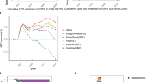 The Paris2C and Paris1.5 C scenarios are designed to achieve the long-term temperature stabilization targets of the Paris Agreement. The Paris Agreement has the long-term goal of “holding the increase in the global average temperature to well below 2 °C above pre-industrial levels and pursuing efforts to limit the temperature increase to 1.5 °C above pre-industrial levels76.” We use the period 1861–1880 to determine preindustrial temperature. We interpret “well below” as targeting an emissions level so that the global mean surface temperature is likely to remain below 2 °C. In IPCC terminology, “likely” is quantified as a 2/3 (66%) chance of occurring77. We interpret the 1.5 °C aim as the median result, achieving it with a 50% probability. For both temperature-target scenarios, we assume all countries meet their NDCs by 2030, after which a global emissions price designed to achieve the long-term target is applied to all greenhouse gases, sectors and regions. Under median values of socio-economic parameters in the EPPA model and our estimates of climate uncertainty, the global emissions trajectories result in a 66% probability of remaining below 2 °C (Paris2C) above pre-industrial levels or a 50% probability of remaining below 1.5 °C (Paris1.5C) above pre-industrial levels. The resulting regional emissions trajectories are then implemented in all ensemble members as emissions caps with trading among sectors, regions and greenhouse gases to ensure that the temperature targets are met in all cases. The emissions caps are binding upper limits on emissions, and assure that the global emissions path determined under median values of socioeconomic inputs are also met when those inputs are uncertain. Under the emissions caps with median parameter settings, there is no emissions trading among regions, as the marginal cost of abatement across regions is already equalized. However, trading will occur as socio-economic uncertainty within the ensembles is sampled.