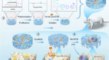 Catechol- and boronic acid-containing copolymers were prepared by functionalizing HA (MW = 300 KDa) with various ratios of DA and AFBA (Tables S1 and S2). The successful introduction of DA and AFBA onto the HA backbone and their degree of conjugation were analyzed by 1H-nuclear magnetic resonance (1H-NMR) (Fig. S1). Mixing 5% (w/v) solutions of HA-DA with HA-AFBA at various mixing ratios (HA-DA: HA-AFBA = 1:1, 1:2, 1:3 (w/w)) at pH 8 gave rise to a three-dimensional polymeric network and subsequent gel formation, as confirmed by the successful completion of a tube inversion test (Fig. S2). The rheological analysis revealed that the storage modulus exceeds the loss modulus in all samples, suggesting a prevalence of solid-like behavior in the rheological profile of the gels (Fig. S3). Notably, within the frequency range of 0.1 to 100 rad/s, the storage modulus exhibits a progressive increase over time, attributed to the pronounced elasticity of the hydrogels formed via catechol-boronic acid binding. The driving force of gelation was due to the well-established reversible binding between boronic acid functionality of AFBA with catechol groups and irreversible catechol-catechol covalent crosslinking of oxidized catechol groups in the presence of oxygen. This dual crosslinking approach was validated using attenuated total reflectance—Fourier transform infrared (ATR-FTIR) spectroscopy (Fig. S4). The FTIR spectrum of polymers post-crosslinking exhibits a distinctive peak at 1480 cm−1, indicative of catechol-boron complex formation. Additionally, a notable decrease in the broadband intensity of hydroxyl groups associated with catechol at ~3300–3400 cm−1 suggests the establishment of covalent catechol-catechol linkages.