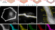 The composition of PD-PZFCNC-HEI was determined by inductively coupled plasma‒mass spectrometry to be Pt0.5022Zn0.2235Ni0.058Co0.0617Fe0.0857Cr0.0688. The energy-dispersive spectroscopy (EDS) mapping results confirm the presence of six elements on a single particle (Figs. 1e–j and S27). The selection of non-precious metal constituents is based on a comprehensive consideration of the atomic radii, formation enthalpy, and reported ORR activity of each component, aiming to obtain highly active high-entropy intermetallic compounds44,45,46,47,48. X-ray photoelectron spectroscopy (XPS) reveals distinct signals of the 0-valent metal species of each element (Fig. S11). The peaks at 71.8, 1021.7, and 575.7 eV correspond to the signals of the metal states Pt0, Zn0, and Cr0, respectively. The fitting results of the Fe 2p spectrum reveal five components, with the first peak positioned at 710.9 eV, corresponding to the metallic state of iron, and the second peak located at 713.5 eV, indicative of the Fe³⁺ oxidation state. This fitting analysis thoroughly accounts for its multiplet splitting structure. The three lines within the energy range 713–720 eV are due to the multiplet splitting phenomenon and the last line, called shake-up at 715 eV, additionally points out Fe3+49. The Ni 2p spectrum is fitted with four components, with the first peak centered at 852.4 eV representing the metallic part of Ni and lines in the range from 855 to 861 eV indicate Ni2+ oxidation states49. The chi-square values for the fitting results of Pt, Zn, Fe, Co, Ni, and Cr are 0.4638, 0.801, 0.0069, 0.79, 0.64, and 0.1932, respectively, indicating relatively high fitting quality50.