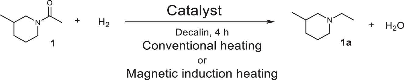 Heating | # | Catalyst | PH2 (bar)a | μ0H (mT) | TReactor (°C) | Conv. (%) | Y1a (%) |