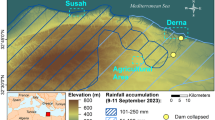 Previous research has emphasized the crucial role of social factors and targeted communication in flood preparedness, highlighting the need for proactive risk management strategies19,20,21,22,23. Effective disaster mitigation requires a balanced approach that integrates both structural and non-structural measures24,25,26. Recent advances in hydrologic, hydraulic, and geotechnical modeling have enhanced our understanding of dam failure mechanisms, particularly the impacts of multiple dam failures during extreme weather events27,28. In this study, we use these modeling techniques to examine the role of dam failures in Derna during Storm Daniel. Our analysis demonstrates how sustained rainfall triggered a series of dam failures, intensifying the flood impact. These findings demonstrate the urgency for improving dam maintenance, enhancing flood management, and bolstering community resilience.