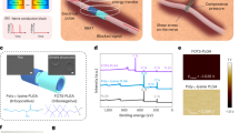 The device slowly bioresorbs when exposed to biofluids, as illustrated in accelerated tests conducted by immersion in phosphate-buffered saline (PBS; pH 7.4) solution at 95 °C (Fig. 1f). The device mostly dissolves within 50 days, and the residual material completely disappears after 80 days. Previous studies show that the rates of biodegradation are ~4.8 × 10−5 g/day, 1.3 μm/day, 0.02 μm/day, and 4.5 nm/day for the main constituent materials, specifically the bioresorbable dynamic covalent polyurethane (PU)8, polyanhydride (PA)9, molybdenum (Mo)10, and monocrystalline silicon (Si) nanomembranes (NMs) respectively11, under physiological conditions (1 × PBS solution at pH 7.4 at 37 °C). Supplementary Fig. 1 shows details of the materials and their thicknesses. Based on expected time-temperature scaling, at physiological temperatures, complete dissolution occurs in ~7 months for PA, 2 years for the Mo electrode, and 2.9 years for the Si NM. For PU, considering its weight (25-mm-diameter PU 75 disks, 100 μm thick, weighing ~0.018 g, the time for complete degradation is 1–1.5 years. Resorption of the cuff electrode occurs first, followed by the extension electrode and the Rx coil structure, and finally, the Si diode within the Rx coil structure. In vivo, complete dissolution typically occurs more rapidly due to macrophage activity, enzymatic processes, and other biological mechanisms. These effects lead to degradation of PU within 1 year12. Based on these considerations and previous studies, dissolution of the Mo electrodes will occur in ~2 years13. The Si NMs will dissolve within 0.5–1.5 years14. Depending on the biofluid environment, the PA will dissolve within 7 to 10 months (Supplementary Table 1)15,16.