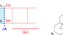 The entanglement structure depends on the symmetries of the reduced density matrix, which stem from the remaining Gauss laws. Specifically, [Sj, ρA(t)] = 0, where in LGT variables, \({S}_{j} := {\prod }_{{\ell }_{j}\in A}{\sigma }_{{\ell }_{j}}^{x}\), with ℓj being the two links originating from a boundary site with lattice coordinates j = (jx, jy) within A. This is a direct consequence of the state being a Gauss-law eigenstate41. In addition, [Vx,A, ρA(t)] = 0 where the long-ribbon operator within A is defined as \({V}_{x,A} := {\prod }_{\ell \in {{{\mathcal{P}}}}}{\sigma }_{\ell }^{x}\) where \({\sigma }_{\ell }^{x}\) acts on the original degrees of freedom along the path \({{{\mathcal{P}}}}\) connecting both boundaries within A, see Fig. 6. Not all symmetry operators are independent. For the quasi-1D chain of plaquettes shown in Fig. 2, only one of the two Sj is independent at each boundary. We place one of the boundaries at sites (0, 0) and (0, 1) and the other at sites (LA, 0) and (LA, 1). We then choose the two independent Sj operators to be S(0, 0) and \({S}_{{L}_{A},0}\), henceforth referred to as \({S}_{A\bar{A}}\) and \({S}_{\bar{A}A}\), respectively. Note that, when acting on a Gauss-law–respecting state \({V}_{x,A}={S}_{A\bar{A}}{S}_{\bar{A}A}\). Consequently, there are four independent symmetry blocks ρA(t) ≡ ⨁s=1,⋯ ,4 ρA,s(t) that will play a role in our analysis. In the dual formulation, these symmetry operators are simply \({S}_{A\bar{A}}^{{{{\rm{dual}}}}}\equiv {\mu }_{k}^{z}{\sigma }_{{\ell }_{\bar{A}A}}^{z}\) and \({S}_{A\bar{A}}^{{{{\rm{dual}}}}}\equiv {\mu }_{k{\prime} }^{z}{\sigma }_{{\ell }_{\bar{A}A}}^{z}\) where k and \({k}^{\prime}\) are the first and last plaquettes within A. We denote the eigenvalue {1, 1}, {1, − 1}, { − 1, 1}, and { − 1, − 1} sectors of \(\{{S}_{\bar{A}A}^{{{{\rm{dual}}}}},{S}_{A\bar{A}}^{{{{\rm{dual}}}}}\}\) operators with labels s = 1, 2, 3, 4, respectively.