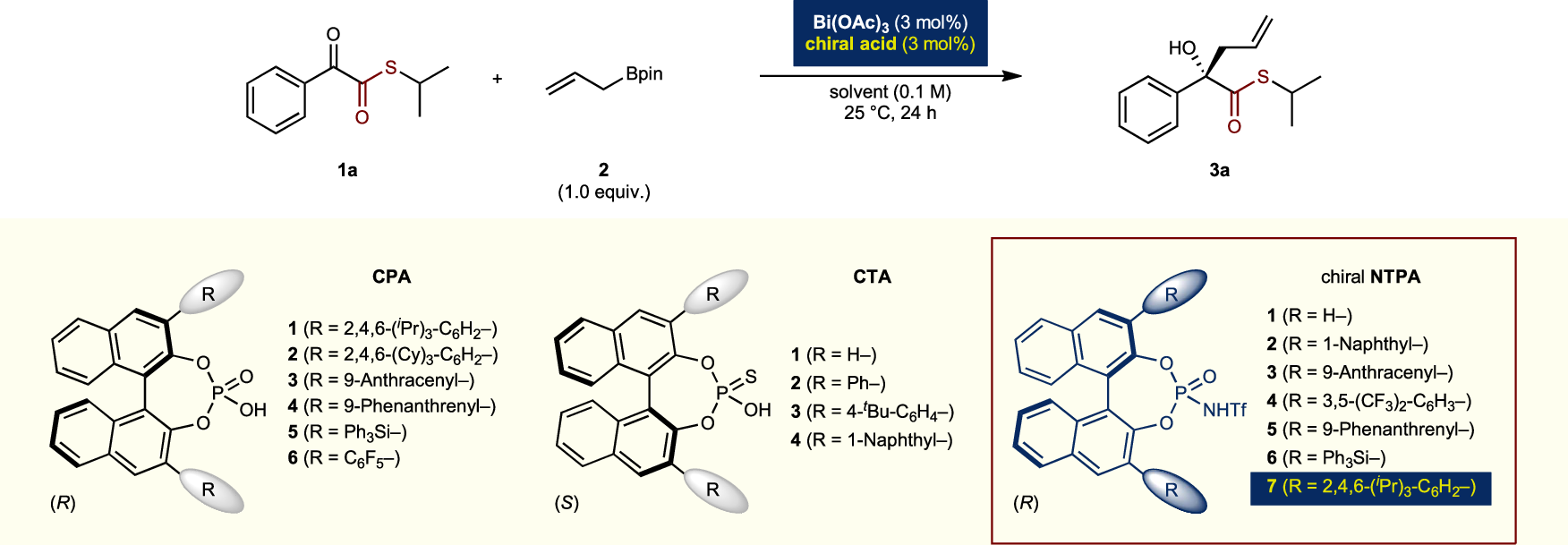 For the model reaction, we selected S-isopropyl α-keto thioester 1a as the acceptor to study catalytic efficiency for acyclic substrates, underdeveloped in previous catalytic systems. Initially, we investigated the reaction between 1a and allylboronic acid pinacol ester (allyl–Bpin, 2), using 3 mol% of Bi(OAc)3 and 1,1′-bi-2-naphthol (BINOL)-derived chiral acid organocatalyst, in CH2Cl2 at ambient temperature for 24 h (Table 1). By exploiting CPA-1 (CPA featuring 3,3′-bis(2,4,6-triisopropylphenyl)-substituents), we obtained the desired chiral S-isopropyl α-hydroxy thioester 3a in 56% conv., whereas with low enantioselectivity (27% ee, Entry 1). Other attempted CPAs did not render satisfactory results (Entries 2–6), driving us to explore alternative core structures, such as chiral thiophosphoric acids. While some promising results were obtained, the efficacy of the CTA scaffold proved to be limited (Entries 7–10).