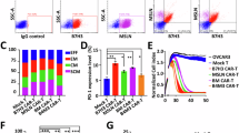 MGA27123, 376.9824, and TE925 scFv’s were cloned into a CD8-28ζ second-generation CAR format containing a CD8α hinge-transmembrane, and expressed in SFG γ-retroviral vector with an EF1α promoter as described previously25,26. A compact epitope tag, RQR827, was co-expressed from the construct to monitor CAR-T transduction efficiency (Fig. 1a). Transgene co-expression between the binders was validated by staining the CAR directly with B7H3-His protein (Supplementary Fig. 1). Against LAN-1 and Kelly neuroblastoma targets, we generally observed enhanced CAR-T cytokine production for 28ζ compared to 4-1BBζ endodomain for all three binders, consistent with previous literature including our own data8,25,28, and which correlated with higher exhaustion/activation marker expression (Supplementary Fig. 2). CD28 costimulation was, therefore, chosen over 4-1BB.