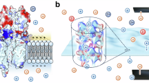 After crown ether modification, the I–V characteristics of the DHTA-Hz-15C5 membrane (Fig. 3c) differed significantly from the AAO and DHTA-Hz membranes. Compared with the I–V curves of the DHTA-Hz membrane, the KCl currents of DHTA-Hz-15C5 decreased, and the conductance value of KCl decreased from 21.52 to 15.9 μS. This is primarily due to the narrowing of the ion transport channels from 8.4 Å to 6.0 Å after incorporating 15C5 into the one-dimensional pore size of the DHTA-Hz membrane. Conversely, the conductance value of NaCl significantly increased from 17.69 to 124.8 μS (Fig. 3d), despite the narrowing of the pores. This substantial enhancement in NaCl transport was attributed to the fact that the crown ether (15C5) within the nano-restricted domain COF channel could act as a specific binding site for Na+, thereby facilitating the transport of Na+. As a result, the Na+/K+ selectivity of the DHTA-Hz-15C5 membrane was significantly increased from 0.82 to 12.38 (Fig. 3e), which was much higher than that of the DHTA-Hz membrane and other membranes already reported (Supplementary Fig. 17 and Table S1). Our synthesized DHTA-Hz-15C5 membrane demonstrates a quite obvious binding effect of 15C5 to Na+ even in the single–ion system, which is very different from the membranes developed in previous studies12,40. In the single–salt experiments, the binding of Na+ to the crown ether 15C5 was significantly greater than K+ binding, which was attributed to the presence of the crown ether 15C5. Additionally, the –OH in the walls of the DHTA-Hz pore was observed to facilitate Na+ transport43,44,45. This conclusion is substantiated by the preparation of TFP-Hz membranes devoid of –OH groups (Supplementary Fig. 18). The oxygen–containing group, in conjunction with the oxygen present in the crown ether, resulted in the formation of an oxygen–rich environment within the slit pore, analogous to that observed in the inner cavity of the crown ether. This led to a comparable Na+ recognition ability and further promotion of Na+ transport, ultimately contributing to a high selectivity of Na+/K+. In the mixed system, the combined effect of the two resulted in facilitated Na+ diffusion within the membrane, while K+ diffusion was prevented, leading to a high Na+/K+ ion selectivity in both single salts and mixed salts (Fig. 3a).