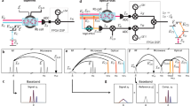 After photodetection on a high speed photodetector, the two beat notes (BN 1 and BN 2) are split equally two ways and then mixed together. The mixing products consist of the following: BN 1 – BN 1, BN 1 + BN 1, BN 2 – BN 2, BN 2 + BN 2, BN 1 – BN 2, and BN1 + BN 2. Only BN 1 – BN 2 and BN 1 + BN 2 are relevant for use in ODFD phase locking. Depending on the polarity of the beat note between the nearest comb line and the SBS lasers, either the sum or difference frequency should be selected after mixing. The resulting RF signal has the common-mode vibration canceled and is then mixed with a reference oscillator to create a phase-locked loop that acts on the DRO frequency to keep the sum/difference constant. A portion of the stabilized DRO is coupled out as the 10 GHz ODFD output. The SBS laser subsystem is on a vibration platform capable of applying a controlled vibration along the three coordinate axes (x-horizontal, y-vertical, and z-out of plane). Particular attention is paid to negating the influence of vibration on all other components of the system beyond the SBS resonator (see Methods ODFD System Configuration). This ensures the ODFD system’s vibration response to be nearly entirely determined by the SBS resonator and the degree of common-mode cancellation we achieve. A flow diagram depicting the signal pathway for accomplishing ODFD is shown in Fig. 2b