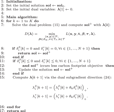 In this section, we introduce an efficient dual-based algorithm for the CFO problem, leveraging structural properties derived from the formulation in (12). The algorithm utlizes a partially dualization technique5,6,37 for the constraints (12b) and (12c). After the partial dualization, we can convert the original problem (12) into a tractable dual problem that can be decomposed into small subproblems and a shortest path problem on the stage-expanded graph. We then update the dual variables by the subgradient method to obtain the final solution. Note that a preliminary version of this algorithm was presented in our conference paper28. In this extended work, we offer a more detailed elaboration of the algorithm, accompanied by a methodological improvement that enhance its clarity and reduce its computational complexity.