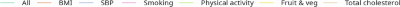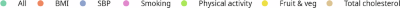 Table 3 summarises the implementation of each of the scenarios. We combined fruit and vegetables into one scenario; environmental tobacco smoking is calculated from smoking prevalence. The risk factor changes occur in 2023 and continue throughout the simulation period. For each level of improvement, we reduced each of the risk factors individually (holding all others constant) and then reduced all risk factors simultaneously.