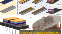 Our breakthrough addresses these limitations through the development of three-dimensional (3D) wound geometries (cases 5–6 in Fig. 1a) that overcomes planar scaling constraints. By vertically winding conductors rather than confining them to planar layouts, the coil radius remains minimally affected by wire thickness, thereby maintaining a nearly constant footprint area (A). Calculated by a discretized Biot-Savart approach, we found that this topological transformation fundamentally alters the scaling law (Supplementary Note 2). For a bare 3D coil, while self-inductance scales linearly, mutual inductance scales approximately quadratically (Lmutual ∝ l2.0, case 5 in Fig. 1b), driving inductance density to D ∝ l1.9 under constant A (Fig. 1c). Integrating a magnetic material layer within the 3D architectures amplifies this effect, yielding in a remarkable boost in self-inductance as Lself ∝ l1.5 and in mutual inductance as Lmutual ∝ l2.5 (case 6 in Fig. 1b). This substantial improvement in scaling arises from two synergistic effects introduced by the 3D magnetic integration. First, once rolled into a 3D coil, the magnetic thin films become sandwiched within the conductor windings so that the magnetic flux generated by these windings is largely parallel to the magnetic layer, thereby intensifying flux coupling in the coil interior. Second, because conductor thickness (typically tens to hundreds of nanometers) is much smaller than its width (a few to tens of micrometers), 3D winding enables a significantly tighter roll than 2D layouts, reducing inter-turn separation and thus further amplifying the local magnetic field and enhancing overall inductance. Given the near-constant footprint area, the resulting superlinear scaling (D ∝ l2.4, case 6 in Fig. 1c) may theoretically yield unprecedented inductance densities, exceeding planar counterparts by more than two orders of magnitude. For instance, for a 10-mm wire with magnetic materials wound in 3D (case 6), D can reach ~40,000 nH/mm2 in theory, while the planar counterpart (case 4) only achieves ~210 nH/mm2 as illustrated in Fig. 1c, with further improvements possible for longer wires.