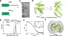 Both protein constructs are monomers in solution, as shown by size exclusion chromatography (SEC) and migrate by SDS-PAGE with molecular weights (MWs) in line with their calculated values of 19.5 kDa (NFI-X176) and 21.4 kDa (NFI-X193), respectively (Supplementary Fig. 2a, b). Thermal denaturation profiles, following the loss of helical structures with increasing temperature using circular dichroism (CD) at 222 nm, indicate that both constructs are stable, and show similar melting temperature (TM) values of 55.6 °C and 56.2 °C for NFI-X176 and NFI-X193, respectively (Supplementary Fig. 2c).