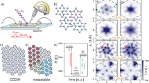 Among vdW materials, the transition metal dichalcogenide 1T-TaS2 attracts attention for its correlated electron phenomena, including various charge-density wave (CDW) states15,16, superconductivity under pressure or doping17,18, and a putative quantum spin liquid phase19,20. At low temperatures it is believed to exhibit a Mott insulating state17,21, characterized by commensurate (C) CDW order formed by star-shaped polaron domains that tessellate the layers below 150–180 K21,22. Moreover, it shows non-thermal, reversible switching to a metastable, metallic “hidden” (H) CDW phase upon application of ultrashort optical or electrical pulses. The lifetime of this HCDW state is short at elevated temperatures and stable below ≈40 K23,24,25,26,27.