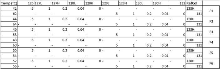 To reduce and alkylate proteins, lysate was first incubated with DTT up to a final concentration of 5 mM for 1 h at RT followed by a 1 h incubation with iodoacetamide added to a final concentration of 20 mM. The proteins were then acetone-precipitated overnight −20 °C and pelleted at 8000 × g for 10 min at 4 °C. Dry pellets were resuspended in 100 µL of 50 mM TEAB and 2.5 µg of Trypsin/LysC (Promega) was added for overnight digestion at 37 °C. TMT labeling (Thermo Fisher) was performed according to the manufacturer’s protocol, and the samples were pooled according to the following scheme: