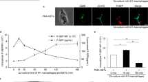 Kupffer cells were isolated from 8 to 12-week-old male mouse liver using the collagenase digestion method described below. After laparotomy, the portal vein was cannulated, and the liver was perfused with HBSS (Cat. No.: 14025092; Thermo Fisher Scientific, Waltham, MA) containing 0.5 mM EGTA (Cat. No.: E3889; MilliporeSigma, Burlington, MA) pre-warmed at 37 °C, followed by perfusion with pre-warmed HBSS-CaCl2 (1 mM) containing 0.5 mg/mL collagenase type 4 (Cat. No.: NC9919937; Worthington Biochemical, Lakewood, NJ). Perfused liver tissue was gently dispersed in a 100 mm cell culture dish using a pair of ophthalmic forceps, and the cell suspension was filtered through a 70 μm cell strainer. After centrifugation of the cell suspension at 50 × g for 2 min at 4 °C, the pellet was collected as hepatocytes and the supernatant was centrifuged at 450 × g for 5 min at 4 °C to obtain non-parenchymal cells (NPCs). NPCs were suspended in 25% Percoll (Cat. No.: 17089101; Cytiva, Marlborough, MA), layered onto 50% Percoll, and centrifuged at 850 × g for 20 min at 15 °C for gradient separation. The interface containing Kupffer cells was collected and further purified by selective adherence to cell culture plates for 3 h in RPMI 1640 medium (Cat. No.: 11875093; Thermo Fisher Scientific) supplemented with 10% heat-inactivated fetal bovine serum (FBS; Cat. No.: A5669801, Thermo Fisher Scientific), 2 mM glutamine (Cat. No.: A2916801, Thermo Fisher Scientific), and 1% penicillin-streptomycin (Cat. No.: 15140122, Thermo Fisher Scientific).