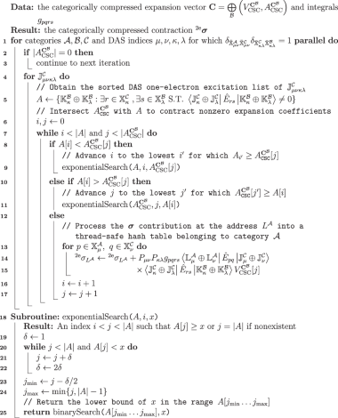 Algorithm 1 shows the categorically compressed STP-DAS algorithm, in which only nonzero elements contribute to the categorical σ-vector. Its advantage over the traditional STP σ-build algorithm31 is twofold: in the outermost loop, where we skip entire categories whose expansion vector vanishes (see lines 2–3), and in the inner loop of line 7, where we only process excitations \(\langle {{\mathbb{J}}}_{\kappa }^{{{\mathcal{C}}}}\oplus {{\mathbb{J}}}_{\lambda }^{{{\mathcal{C}}}}| {\hat{E}}_{rs}| {{\mathbb{K}}}_{\kappa }^{{{\mathcal{B}}}}\oplus {{\mathbb{K}}}_{\lambda }^{{{\mathcal{B}}}}\rangle\) for which \({C}_{{K}^{{{\mathcal{B}}}}}\ne 0\).