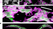 Worms were maintained at 20 °C on peptone rich (8P) nematode growth media (NGM) plates spotted with OP50-1 E. coli (Caenorhabditis Genetics Center (CGC)), except for those noted in Supplementary Table 1 that were maintained at 15 °C. All experiments were performed at 20 °C unless otherwise stated. Worms were fed for at least two generations before being used for experiments. Hermaphroditic animals were used in all experiments. A detailed list of strain information can be found in Supplementary Table 1. Strains were backcrossed at least 3–5x to N2 worms prior to use in experiments, except RB1104 and VC1099 due to sterility issues upon backcrossing. All strains used in this study are available upon request by contacting the corresponding author.
