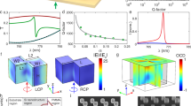 where \({\mu }_{r}=1+({\omega }_{0}+i\alpha \omega ){\omega }_{m}/({({\omega }_{0}+i\alpha \omega )}^{2}-{\omega }^{2})\),\({\mu }_{k}=\omega {\omega }_{m}/({({\omega }_{0}+i\alpha \omega )}^{2}-{\omega }^{2})\), \({\omega }_{m}=4\pi \gamma {M}_{s}\), \({\omega }_{0}=\gamma {\mu }_{0}{H}_{0}\), \(4\pi {M}_{s}=0.195{{\rm{T}}}\) is the saturation magnetization, \({\mu }_{0}{H}_{0}=0.042{{\rm{T}}}\) is the external magnetic field, \(\gamma=1.76\times {10}^{11}\,{{{\rm{s}}}}^{-1}{{{\rm{T}}}}^{-1}\) is the gyromagnetic ratio, \(\alpha=0.0001\) is the damping coefficient, and ω is the operating frequency. The Dirac masses of the Chern photonic crystals can be controlled by the direction of the external magnetic field, which can be tuned by the direction of magnets in the experiment. Both the ceramic and YIG rods have a height of 5 mm, and are sandwiched between two metallic plates to mimic the two-dimensional condition. Photonic modes with transverse magnetic polarization are considered in this work.