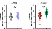MN assays were performed as previously described in refs. 59,60,61. Heat-inactivated human sera were serially diluted 2-fold and incubated with one hundred 50% tissue culture infection dose (TCID50) of influenza viruses. The virus-serum mixture was used to infect 1.5 × 104/well MDCK cells and incubated overnight. The plates were fixed with cold 80% acetone and the presence of viral nucleoprotein was quantified by enzyme-linked immunosorbent assay (ELISA). Microneutralization titers were defined as the reciprocal of the highest serum dilution that showed 50% neutralization. Antibody titer <10 (initial dilution) was reported as 5 for statistical analysis.