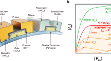 SWCNT thin films with optical transmittance values (at 550 nm) of 98%, 96%, 94%, 87%, 79%, and 60% were prepared. Hereafter, each sample will be referred to by its measured optical transmittance at 550 nm. According to34 the thickness of the corresponding SWCNT films can be estimated as approximately 2, 4, 6, 14, 24, and 53 nm, respectively. Figure 1 presents representative structural characterization data drawn from typical SWCNT films in this series. The thin films contain predominantly single-walled carbon nanotubes as directly observed with transmission electron microscopy (TEM; number of walls, Fig. 1c) as well as ultraviolet/visible/near-infrared spectroscopy (UV-Vis-NIR; appearance of the transitions between van Hove singularities, Fig. 1a) and Raman spectroscopy (the presence of radial breathing modes (RBM) characteristic to SWCNT; Fig. 1b). Graphitic sp2-carbon structure manifests itself via the presence of a π-plasmon (Fig. 1a) and a characteristic G mode (Fig. 1b), while the low intensity of a D mode (Fig. 1b; IG/ID=41) verifies low concentration of defects and the high-quality of the produced samples. The films are formed by individual SWCNTs and their agglomerates (bundles; Fig. 1c), while the catalyst remains within the film without any effect on transparency in the visible light range or the conductivity35. The individual nanotubes and their bundles form a randomly-oriented highly porous network, as revealed by scanning electron microscopy, (SEM; Fig. 1d) with uniform spatial distribution (Supplementary Fig. 1b). A more detailed structural characterization of the thin SWCNT films employed here has been carried out in36,37.