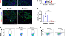 In order to decipher the molecular patterns that are associated with immune cell evasion and metastasis in SCLC, we analyzed publicly available single-cell RNA sequencing (scRNA-seq) data10 and searched for differentially expressed genes between primary and metastatic lesions. Here, we observed a significant downregulation of B2M in metastases compared to primary tumor lesions of patients with SCLC (Fig. 1a–c). B2M encodes β2-microglobulin, a non-polymorphic subunit of the MHC-I complex essential for its surface expression and stability11. To confirm our transcriptional findings, we further examined MHC-I protein expression via immunohistochemistry in a unique collection of six matched samples of primary and metastatic SCLC lesions (Fig. 1d). We found that MHC-I expression is strongly reduced in liver metastases in direct comparison to matched primary SCLC in the lung of the same patients (Fig. 1d, e). We next aimed to validate this finding in an autochthonous, conditionally Rb1/Trp53-depleted SCLC mouse model and again analyzed matched samples of primary and metastatic SCLC lesions. In line with our SCLC patient-derived data, we found that MHC-I expression was strongly reduced in metastatic lesions, compared to the primary SCLC tumor (Fig. 1f). We thus speculated that loss of MHC-I mediates immune evasion in metastatic SCLC. We next sought to investigate the impact of loss of MHC-I on SCLC cells in an immunocompetent mouse model. Using CRISPR-CAS9 KO technology, we successfully knocked out MHC-I on murine SCLC cells (Fig. 2a–c). We injected these SCLC MHC-I KO intravenously into immunocompetent and immunodeficient mice and monitored the formation of liver metastases by MRI (Fig. 2d). Strikingly, KO of MHC-I on SCLC cells abrogated immunosurveillance in an immunocompetent model and induced a massive metastatic spread in the liver and lymph nodes (Fig. 2e) accompanied by T cell reduction and reduced CD8 T cell activity (Fig. 2f, g). At the same time, we did not observe an increased infiltration of activated NK cells in MHC-I KO tumors (Supplementary Fig. 1a). Further metastatic spread was limited due to rapid massive spread into the liver and early death (Supplementary Fig. 1b). In contrast, intravenous injection of WT and MHC-I KO led to an equivalent metastatic engraftment in immunodeficient mice (Fig. 2h). Furthermore, we injected SCLC MHC-I KO or SCLC WT orthotopically into immunocompetent mice and observed that MHC-I KO cells generated a higher tumor load in the lung than SCLC WT cells and were characterized by a markedly reduced CD8 T cell infiltration, indicating that loss of MHC-I evades T cell immunosurveillance (Supplementary Fig. 1c–k). Thus, our data strongly indicates that loss of MHC-I on SCLC cells drives immune cell evasion and the formation of metastases in SCLC.