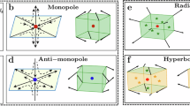 where ri is the location of particle i, ei is the eigenvector component for particle i, and w is a Gaussian weighting function, \(w({{\bf{R}}}-{{{\bf{r}}}}_{i})=\exp (-| {{\bf{R}}}-{{{\bf{r}}}}_{i}{| }^{2}/{\Delta }^{2})\), with a width of Δ = 1. (The exact value of Δ is not crucial as long it is on the order of the size of a particle.) The topology of this vector field is then analyzed by projecting it on a cubic lattice of size 88 × 88 × 88 superimposed to the sample (the length of the unit cell is thus ≈ 1). This lattice is subsequently used to identify the topological defects as follows, see Inset of Fig. 1: For each of the six square sides of a cubic unit cell, we search for a signature of a topological defect by examining the structure of the phase of the field u(R), after having it projected on the square, on the border of the plaquette via a line integral. If this integral gives a net change of ± 2π, one has a vortex or an anti-vortex, while a charge zero corresponds to a field with no singularity. In practice, we assign to each plaquette (having its corners at A, B, C, and D and being, e.g., in the xy-plane) a winding number νx,y defined as