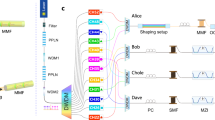 where \({T}_{0}=\frac{2L}{c}+{T}_{{{{\rm{ovh}}}}}+\Delta t\) is the averaged time cost of each entangling attempt with a single-mode quantum memory. Note that here we assume the success probabilities in all the modes are the same. We illustrate the multiplexing enhancement versus mode number in Fig. 1c. One can see that given a fixed time interval Δt, the multiplexing enhancement M increases with N and saturates around \({N}_{0}=\frac{\frac{2L}{c}+{T}_{{{{\rm{ovh}}}}}}{\Delta t}\), where the duty-cycle of entangling attempts reaches 50% (duration for entangling attempts NΔt is equal to all the waiting time \(\frac{2L}{c}+{T}_{{{{\rm{ovh}}}}}\)). In this case a multiplexing enhancement of \(M=\frac{{N}_{0}+1}{2}\approx \frac{{N}_{0}}{2}\) can be achieved. This 50% duty cycle can be regarded as an indication that ‘sufficient’ multiplexing has been employed, as further increase of N can only improve the multiplexing enhancement by a factor of less than twice.