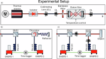 The TDC integrated into the SS-SPL module required precise measurement under a common-mode noise environment of up to several hundred millivolts and supported advanced functionalities such as time–walk error correction based on the number of incident photons. The two-stage TDC was implemented, comprising an inverter ring operating at ~1.1 GHz for coarse timing and the pulse-shrinking gated buffering ring (PSGBR) architecture30,47, which provided ~2 ps of pulse shrink per buffer stage, for fine timing. A relatively strong signal waveform measured at the node between the isolation transfer and the differential amplifier is shown in Fig. 4a. The signal pulse width was estimated to be 920 ps. The base-level voltage increased gradually over the first ~20 ns and stabilized thereafter, which suppressed erroneous measurements caused by stray laser light. The distributions of time differences between Ch-1 and Ch-3, Ch-1 and Ch-4, and Ch-3 and Ch-4, with standard deviations of \({\sigma }_{{{\mathrm{TDC}}}\left({{\mathrm{ch}}}3-{{\mathrm{ch}}}1\right)}=4.2\) ps, \({\sigma }_{{{\mathrm{TDC}}}\left({{\mathrm{ch}}}4-{{\mathrm{ch}}}1\right)}=4.7\) ps, and \({\sigma }_{{{\mathrm{TDC}}}\left({{\mathrm{ch}}}4-{{\mathrm{ch}}}3\right)}=4.8\) ps, respectively, are shown in Fig. 4b. Since each channel operated independently, the standard deviation for each channel was obtained from these time-difference distributions, which represented the convolution of the noise distribution from each channel. Accordingly, the estimated standard deviations were \({\sigma }_{{{\mathrm{TDC}}}\left({{\mathrm{ch}}}1\right)}=2.9\) ps, \({\sigma }_{{{\mathrm{TDC}}}\left({{\mathrm{ch}}}3\right)}=3.1\) ps, and \({\sigma }_{{{\mathrm{TDC}}}\left({{\mathrm{ch}}}4\right)}=3.6\) ps. The resulting single-shot noise levels were significantly low to allow estimation of the number of incident photons based on inter-channel correlations.