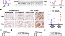 A FAM84A expression as determined by western blot in CSC. B FAM84A protein expression as determined by western blot in tumor tissues from transgenic mice. C Correlation between ALKBH5 and FAM84A protein expression in the TMA patient cohort (N = 164, Chi-square, two-sided). D FAM84A mRNA stability as determined by qPCR after ALKBH5 knockdown in POP66. RNA decay rate was normalized to expression at 0 hr. (n = 3, each dot represents an independent sample. Two-way ANOVA) E FAM84A mRNA stability as determined by qPCR after ALKBH5 overexpression in POP66. RNA decay rate was normalized to expression at 0 hr. (n = 3, each dot represents an independent sample. Two-way ANOVA) F Plasmid design for the luciferase reporter assay with FAM84AWT 5’UTR (upper panel), luciferase activity of FAM84AWT reporter with ALKBH5 knockdown and FAM84AWT reporter with the overexpression of WT ALKBH5 (A5-OE) or mutant ALKBH5 (A5H204A) in POP66 (n = 3, each dot represents an independent sample. One-way ANOVA) (lower panel). G Plasmid design for luciferase reporter assay with mutated 5’UTR (FAM84AMut) sequences added to the 5’ end of luciferase gene (upper panel), luciferase activity of FAM84AMut reporter with ALKBH5 knockdown and FAM84AMut reporter with the overexpression of WT ALKBH5 (A5-OE) in POP66 (n = 3, each dot represents an independent sample. One-way ANOVA) (lower panel). H Heatmap for m6A reader screening. I Schematic diagram for RIP-qPCR assay (left panel). Binding between IGF2BP1 protein and FAM84A mRNA was determined by RIP-qPCR in POP66 (n = 3, each dot represents an independent sample. Student’s t-test, two-sided) (right panel). J Effect of IGF2BP1 knockdown on the stability of FAM84A mRNA in POP66 with or without ALKBH5 knockout (n = 3, each dot represents an independent sample. Two-way ANOVA). K Effect of IGF2BP1 knockdown on FAM84A mRNA (n = 3, each dot represents an independent sample. One-way ANOVA) (left panel) and protein (right panel) in POP66 with or without ALKBH5 knockout. Centers and error bars represent mean and Standard deviation, respectively.