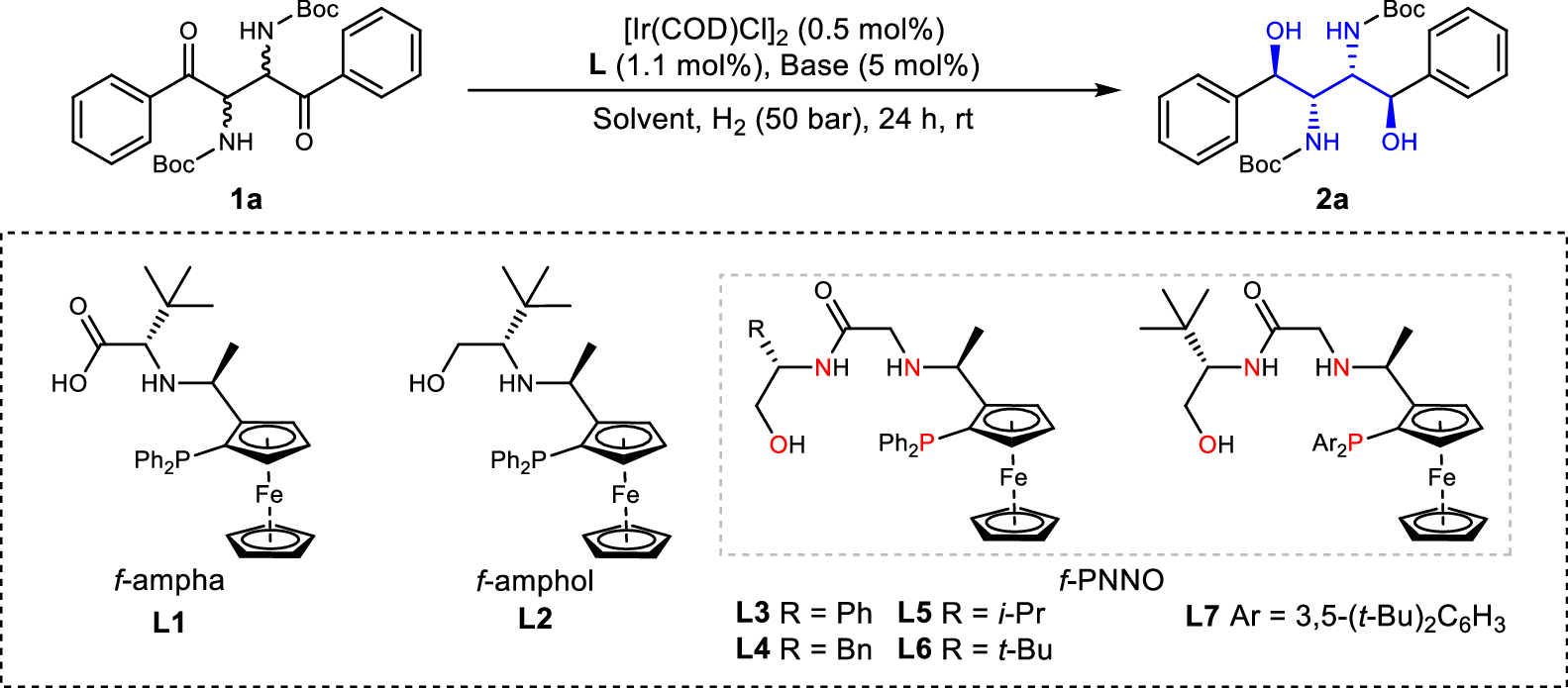 Our initial studies commenced with the optimization of reaction conditions by choosing the Ir-catalyzed asymmetric hydrogenation of the mixture isomers of N-Boc protected 2,3-diamino-1,4-diphenylbutane-1,4-dione 1a as a model reaction. The tridentate chiral ligands f-Ampha L1 and f-Amphol L2 which have excellent performance in the AH of ketones were evaluated67,68, to our depression, both of them gave a very complicated mixture of mono-reduction product, double-reduction product and their isomers (Table 1, entries 1-2). Then the f-PNNO type tetradentate ligands which were developed by our group69 and Prof. Zhang group were employed70,71, and the results revealed that the f-PNNO type ligands are very efficient for this transformation, afford the target product with high yields and excellent stereoselectivities (90-99% yield and 93-99% ee, Table 1, entries 1-7). Among them, L6 had the best performance in this transformation, affording 2a with 99% yield and more than 99% ee (Table 1, entry 6), thus it was chosen as the best ligand for further optimization. Subsequently, the solvent effect was investigated, and the results disclosed that solvents have only a slight effect on the enantioselectivity of this reaction but a significant impact on the yield. When EtOAc, n-hexane, and i-PrOH were used as solvents, only moderate yields were obtained albeit the enantioselectivity remained very high (Table 1, entries 8-10). The reaction was inhibited when the reaction was conducted in MeOH or 1,4-dioxane (Table 1, entries 11-12). Next, a series of bases were evaluated to examine their effect on the DKR process. The results revealed that the base exerted a significant influence on this transformation, with Cs₂CO₃ emerging as the most efficient (Table 1, entries 13–18). Its superior performance is likely due to the synergistic effects of its optimal basicity and the favorable contribution of the cesium cation.