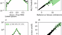 MD simulations were performed using the Atomic Simulations Environment (ASE) Python library61. The simulations are set with a timestep of 0.1 fs in the canonical (NVT) ensemble. The Berendsen thermostat62 was used with a coupling temperature of 300 K and a decaying time constant τ of 100 fs. The atomic velocities were initialized according to the Boltzmann distribution at 300 K. The initial water configuration was selected from the water test set. The LiFePO4 configuration was obtained from the Materials Project, comprising 168 atoms in the unit cell. The PDMS configuration was constructed using three polymer chains with a polymerization degree of 25 and a density of 0.97 g ⋅ cm−3, containing 759 atoms in total. All systems were modeled with periodic boundary conditions.