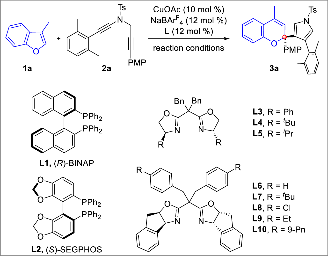 Table 1 Optimization of reaction conditions for asymmetric dearomative single-atom skeletal editing of benzofuran 1a with diyne 2aa