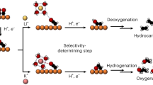 For CH4 production, in the lower overpotential range (E > ca. −0.75 V), the Tafel slope is 67 mV dec−1 for TMA (Fig. 3c). It is close to the theoretical value of 59 mV dec−1 when the chemical step after a single electron transfer reaction serves as the RDS49. Although the coverage of reactants (e.g., *CO and *CO(H)) can affect Tafel slopes, recent studies have shown a low coverage of *CO on the Cu surface at 1 atm23,50, and thus coverage effects will not significantly influence Tafel slope analysis. Therefore, the first charge-transfer step (*CO + H2O + e− → *CO(H) + OH−) is unlikely to be the RDS for CH4 formation. Instead, it is probable that the subsequent chemical hydrogenation between *CO(H) and *H is the RDS, which is consistent with the views in the literature22. Notably, this is based on the assumption that the *H coverage remains constant and is independent of potential change (Case 1 in Supplementary Note 1). However, the Tafel slope could decrease further if the *H coverage varies with the potential (Case 2 in Supplementary Note 1). Theoretically, when the *H generation from water dissociation (Volmer step: H2O + e− → *H + OH−) is regarded as a pseudo-equilibrium step, the resulting Tafel slope could be lower and approach a minimum value of 30 mV dec−1 (Eq. S10, neglecting reactant coverage influence). The obtained Tafel slope indeed becomes lower for these larger cations and drops to 41 mV dec−1 in the TPA electrolyte (Fig. 3c), which corresponds well to Case 2. This is because a looser EDL, formed by large cations, improves water accessibility to the electrode surface (i.e., sufficient water supply), thus making the subsequent water dissociation more sensitive to potential changes. Regarding the largest TBA cation, there is an anomalous slight increase in the Tafel slope. It can be attributed to the fact that the further enhanced water accessibility allows more water adsorption/dissociation on the electrode surface and thus suppresses *CO adsorption, as evidenced by in-situ Raman spectra showing that the *CO band vanished completely after −0.7 V (Supplementary Fig. 9).
