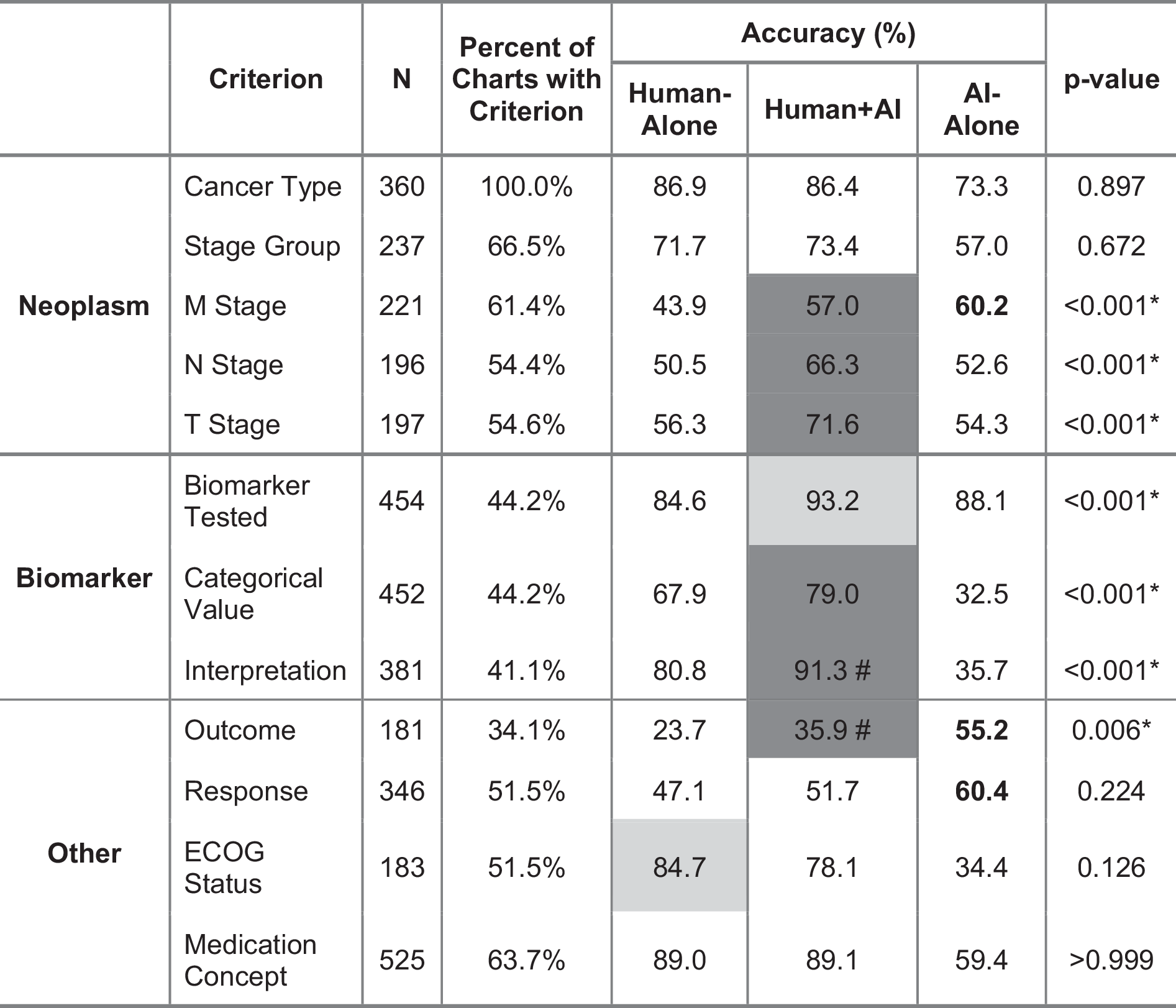 1. Criteria found to have significantly different mean accuracy between the Human+AI and Human-Alone arms are denoted with an asterisk. All criteria with significant differences were found to have significant superiority in favor of the Human+AI arm based on a second set of hypothesis tests. Both sets of tests were conducted at alpha level 0.05 and adjusted for multiple comparisons. Cells in light grey indicate a difference greater than 5% between Human-Alone and Human+AI, and cells in dark grey indicate a difference greater than 10%. Criterion for which the AI-Alone arm outperforms the Human-Alone and Human+AI arms are noted with bolded values. Two-sided, paired binomial exact tests with Bonferroni correction were conducted. Superiority of the Human+AI arm for criterion-level abstraction was assessed for significant criteria with an additional one-sided hypothesis with an unspecified superiority margin.