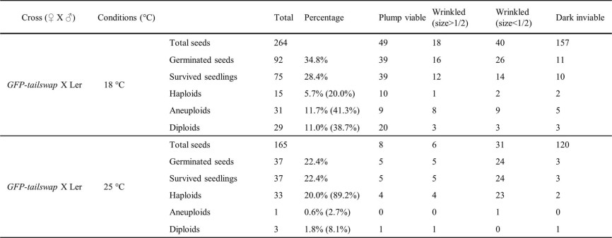 1. Seeds from five siliques collected from outcrossing of GFP-tailswap (18 °C and 25 °C) by pollen of Ler (22 °C); On the basis of shrink level, seeds are divided into four groups: dark inviable seeds, wrinkled seeds (size < 1/2), wrinkled seeds (size > 1/2), and plump viable seeds; then transfer each group of seeds into 1/2 MS medium and grow. After two weeks, gemination rates were counted, and the resulting seedlings were transplanted into nutrient soil, and count the proportions of haploids, aneuploids, and diploids. Percentage values in bracket are the proportions of haploid, aneuploid and diploid in all surviving plants. The HIR of GFP-tailswap tested at 18 °C and 25 °C using Percival (AR-41L3) plant growth chamber.