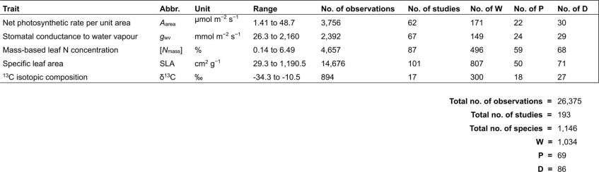 Extended Data Table 1 Range of variation in leaf ecophysiological traits and summary of data compilation
