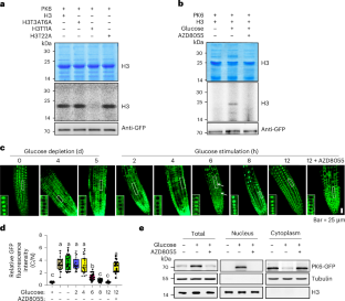 (a) The PK6-driven GUS activity was assessed under glucose depletion and stimulation in four-day-old seedlings. Bar, 1 mm. (b) Relative transcript levels of PK6, PK7, and PK8 under glucose depletion and stimulation. Experiments were repeated at least three times, and the results of representative experiments are shown as means ± SE, n = 3. No difference is indicated as ns. Tubulin 8 was used as a negative control. The source data underlying the statistical analysis are provided in the Source Data file.