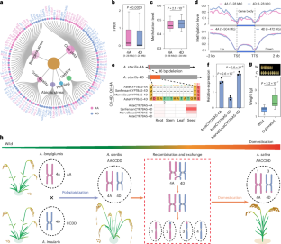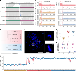 a, The Illumina read coverage of the chromosome 4D. Ains: A. insularis. b, The gene collinear between the start of chromosome 4A and 4D. c, Hi-C contact map showing a translocation event occurred from 4A to 4D and this fragment exist two copies. d, FISH confirms the duplication segment in cultivated oat, as observed in cells at the metaphase of mitosis. This experiment was repeated independently at least three times with similar results. e, Differential transcript expression patterns of genes located on start (1–28 Mb) of chromosome 4A and 4D in A. sterilis. f, Expression of genes in chromosome 4A and 4D in A. sterilis.