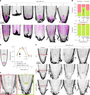 a W50/W200 ratio in WT and a moderate p35S:MIR396 line during regeneration. n represents the number of observed roots. b Root elongation for control (uncut) and cut WT and moderate p35S:MIR396 lines after cutting at 100 µm from the tip. n represents the number of observed roots. Red asterisks indicate significant differences with uncut controls (two-sided repeated measures ANOVA, p < 0.01). c Regeneration of the same lines as in a and b after cutting at 100 µm from the tip. d WT and moderate p35S:MIR396 root tips during early regeneration after cutting at 100 µm, stained with Lugol’s solution to visualize starch granules. e Phenotype frequencies for WT, moderate and strong p35S:MIR396 lines after cutting at 100 µm from the tip. White asterisks indicate significant differences with WT in closed state proportion (χ2 test, α = 0.05, degrees of freedom = 1). N indicates the number of experiments from which the frequencies were averaged; Total n indicates the total number of roots included in all said experiments. f Frequencies for conical and cylindrical (W50/W200 ratio < 0.7 and ≥ 0.7, respectively) roots in the same lines as in e after cutting at 100 µm from the tip. White asterisks and n as in e. n represents the number of observed roots. Error bars in a, b and e indicate standard error of the mean. Dashed red lines indicate cut position. White arrowheads mark the uncut or regenerated QCs.