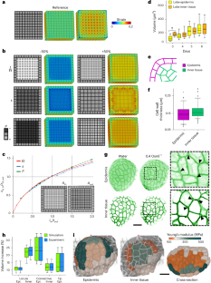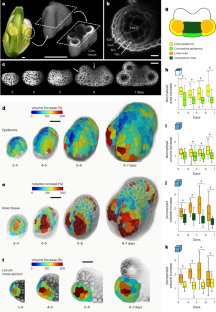 a, 2D meshes extracted from the top-to-bottom and bottom-to-top confocal microscopy scans of the same plasmolyzed sample Cell junctions are highlighted in red. We compute the transformation from one 3D point cloud to the other, M b, Starting mesh and transformed mesh obtained by applying half the transformation M1/2 to the former. The heatmap of volume increase of each cell from the plasmolyzed experimental state to the turgid. c, Pooling of cells into regions. Regions are based on layer, connectivity and volume increase displayed in b. Scale bars, 5 μm.