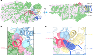 a, Superposition of the TEF30-C (gray), TEF302-C2-I (sky blue), TEF302-C2-II (pink) and TEF30-C2S (light green) structures on the TEF30-C regions. The other parts of TEF302-C2-I, TEF302-C2-II and TEF30-C2S are omitted for clarity. The cartoon models except that of TEF30 are shown in the transparent mode. b, The cartoon model of TEF30 illustrating its secondary structures. The β-sheets and α-helices are indicated by the arrows and cylinders. c, The TEF30-C structure showing the position of TEF30 in the complex. Left: Stromal view; right: side view. TEF30 is shown as the cartoon and transparent surface models, PSII-C is presented as surface model.