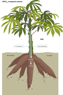 Engineering cassava with a modified potassium (K+) channel gene from Arabidopsis thaliana enhances K+ transport, photosynthesis and storage root yield, offering a sustainable strategy to boost productivity and resilience in nutrient-poor and drought-prone environments.