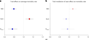 Effects of species functional traits on average mortality rate and their temporal changes across biomes. Points show estimated hazard ratios with 95% confidence intervals for maximum tree height (Hmax), specific leaf area (SLA) and wood density (WD). Traits with positive effects on mortality are shown in red, and those with negative effects in blue. Species numbers were 135 in tropical savannas, 522 in tropical rainforests, 282 in warm temperate forests, and 126 in cool temperate forests.