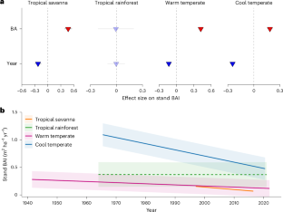 Temporal patterns of tree growth rate across four major biomes and their dependence on tree- and stand-level characteristics. a, Fixed effects of stand basal area (BA), diameter at breast height (lnDBH), and year on annual tree growth rate. Red and blue triangles denote significant positive and negative effects, respectively. b, Modelled annual tree growth rates over time. Solid lines show significant temporal trends with shaded 95% confidence intervals; dashed lines denote non-significant trends. Trees with DBH > 80 cm (2% of total) were excluded due to nonlinear growth responses not captured by the linear model (see Supplementary Fig. 10).
