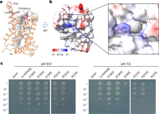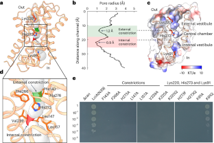 a, Cut-open electrostatic potential surface viewed from the membrane plane shows the channel architecture, including the external vestibule, central chamber and internal vestibule divided by two constrictions. The zoomed-in view shows the residues constituting the constrictions. b, Functional analysis of the LciA mutations in the E. coli Δcan strain at pH 7.0. All mutations were performed in the LciAN39 truncation.