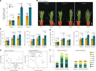Extended Data Fig. 7 SynM enhances growth and organic N uptake of OsLHT1a and OsLHT1b cultivars under field conditions.
