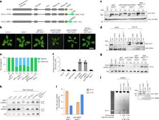 a, Photos of 3-week-old Col-0, dcl2-1, gD2/dcl2-1, healthy gD2-CEND/dcl2-1, healthy gD2-RBD2/dcl2-1, and gD2-RBD2mutLW/dcl2-1 transgenic plants. White triangles indicate the 5th-6th rosette leaves. The quantitative values below the photos represent the length-to-width ratio of 5th-6th rosette leaves. Data are represented as means ± SD (n = 10 rosette leaves per genotype, except gD2-CEND/dcl2-1, n = 9). Scale bar = 2 cm. b, Phenotypes of Col-0, dcl2-1, dcl4-2, gD2/dcl2-1, gD2-RBD2/dcl2-1, and gD2-RBD2mutLW/dcl2-1 plants infected with CMV. 4-week-old plants of the indicated genotypes were inoculated with CMV and grown for additional 2 weeks. Scale bar = 1 cm. White triangles indicate CMV symptoms, including small and deformed leaves that were bunched together.